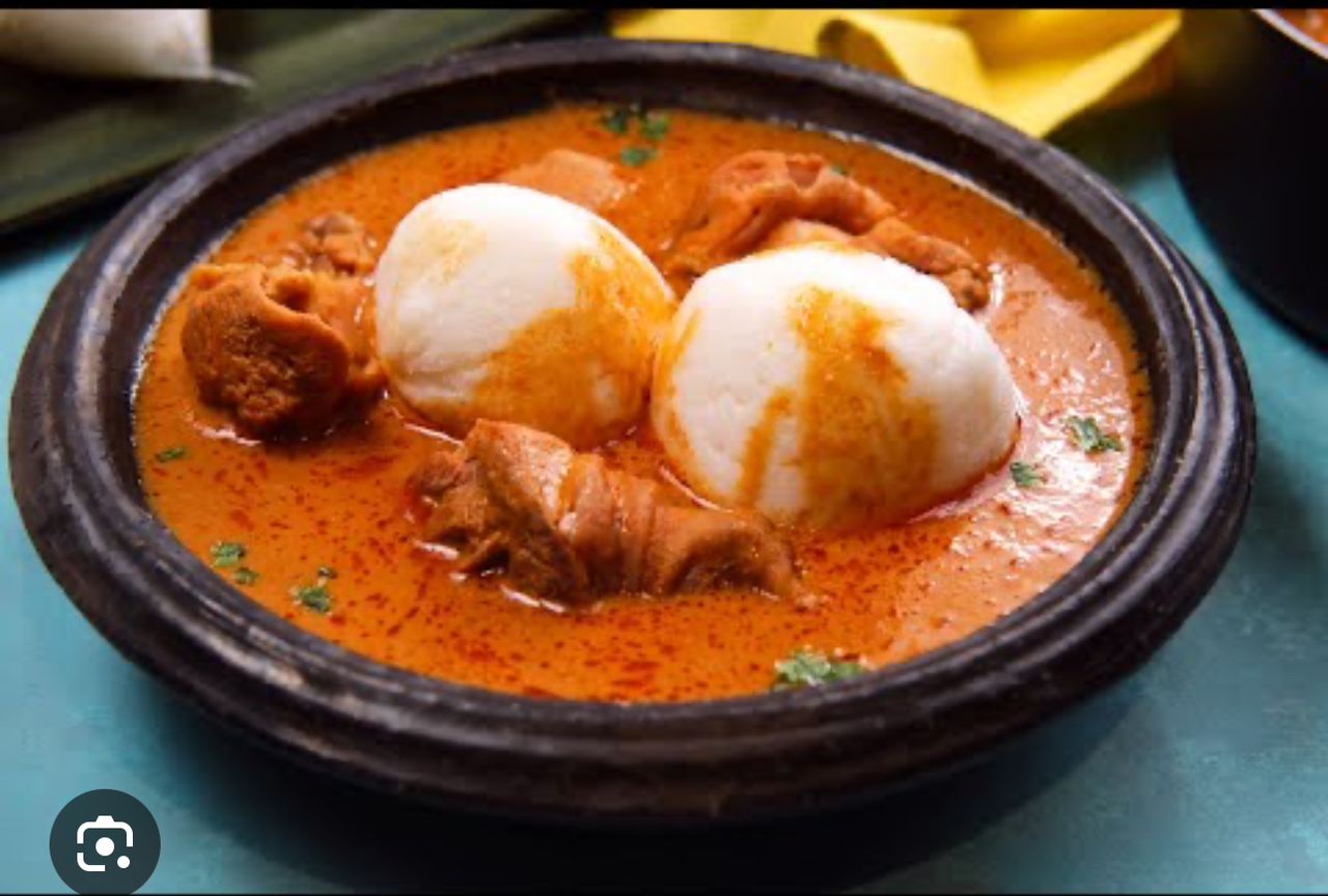 Pounded cassave and plantain with palmnut soup